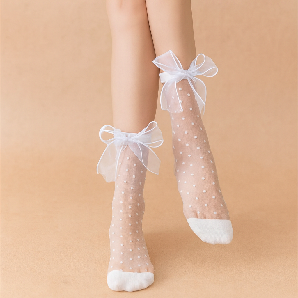 (1 Paar) Nylon Damen Socken Fashion Spitzen Strümpfe Füsslinge mit Punkten + Schleife (One Size) - Weiss