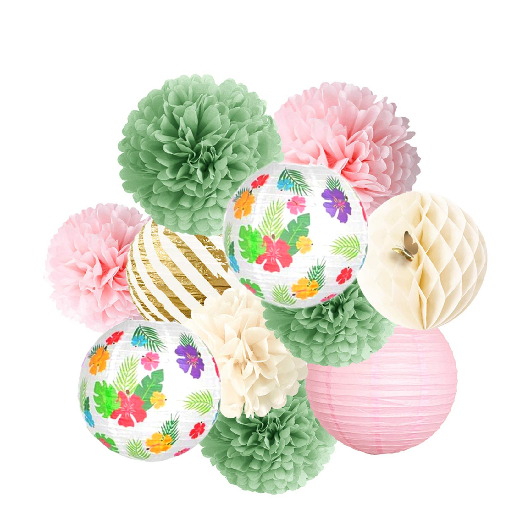 (11-tlg. Set) Papier Lampions Sommer Party Deko Pompon's Hawaii Wabenkugel - Rosa / Grün