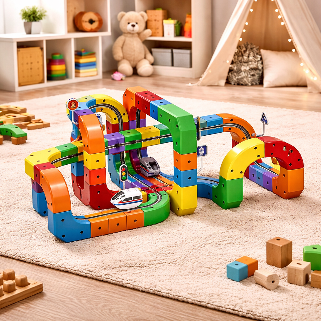Die zahlreichen Schienen-Elemente ermöglichen verschiedenste Aufbauvarianten und fördern dabei gezielt die motorischen und kognitiven Fähigkeiten. Gleichzeitig wird durch das integrierte STEAM-Konzept spielerisches Lernen unterstützt – ideal, um Technik, Logik und Kreativität miteinander zu verbinden.