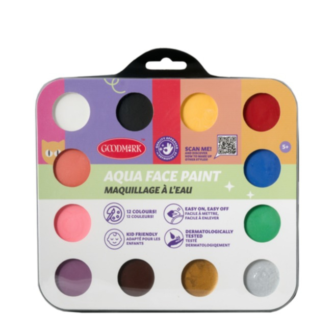 Coole Temporär Gesichts Schminkfarbe für einen ausgefallenen Look! Unser praktischer Aqua Malkasten von Goodmark mit 12 verschiedenen Farben ist genau das Richtige, wenn Du ein simples Kostüm zu etwas Einzigartigem machen möchtest. So einfach gehts:
