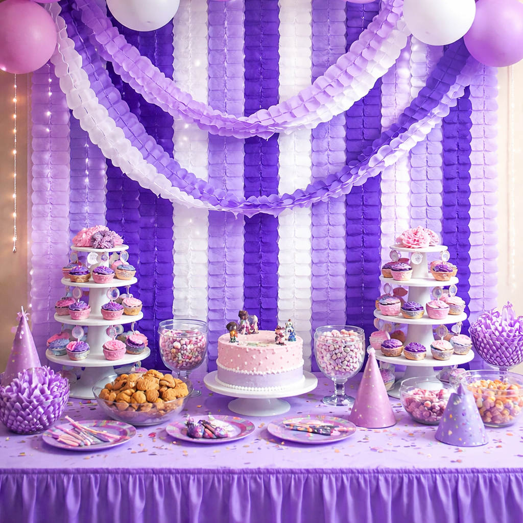 Mit dieser dekorativen Papier Girlande bringst du sommerliche Stimmung und frische Farben in deine Feier. Das elegante Kleeblatt Banner in Lila, Violett und Weiss sorgt für eine harmonische und zugleich auffällige Party Deko, die sich ideal für Gartenpartys, Geburtstage oder Events im Sommer eignet.
