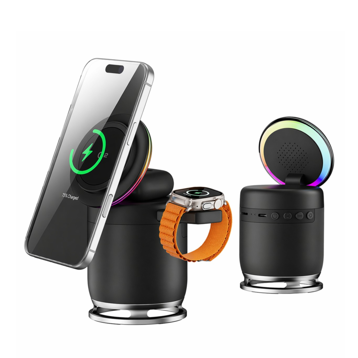(15W) 5in1 MagSafe Qi Wireless Charger Ladegerät Faltbare Ladestation mit LED Beleuchtung + Lautsprecher - Schwarz