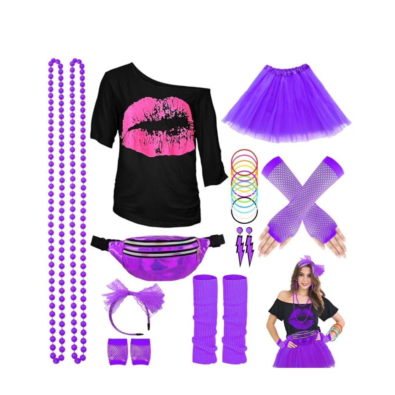 Zum 22-tlg. Kostüm gehören neben Shirt und Rock eine passende Bauchtasche, Beinstulpen sowie Schmuck, die den typischen 80s Look perfekt abrunden. Die kräftige Farbe Lila unterstreicht den neonfarbenen Stil und macht die Verkleidung ideal für ausgelassene Feiern und bunte Events.