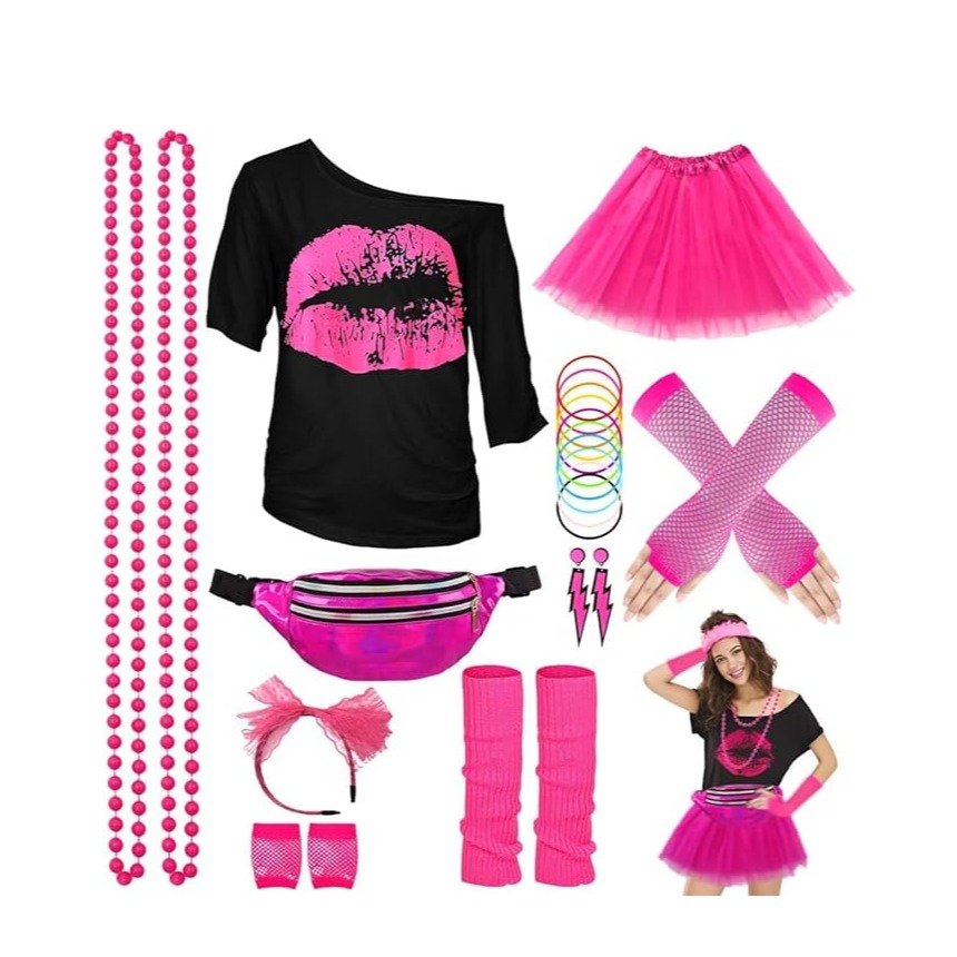 Zum 22-tlg. Kostüm gehören neben Shirt und Rock eine passende Bauchtasche, Beinstulpen sowie Schmuck, die den typischen 80s Look perfekt abrunden. Die kräftige Farbe Pink unterstreicht den neonfarbenen Stil und macht die Verkleidung ideal für ausgelassene Feiern und bunte Events.