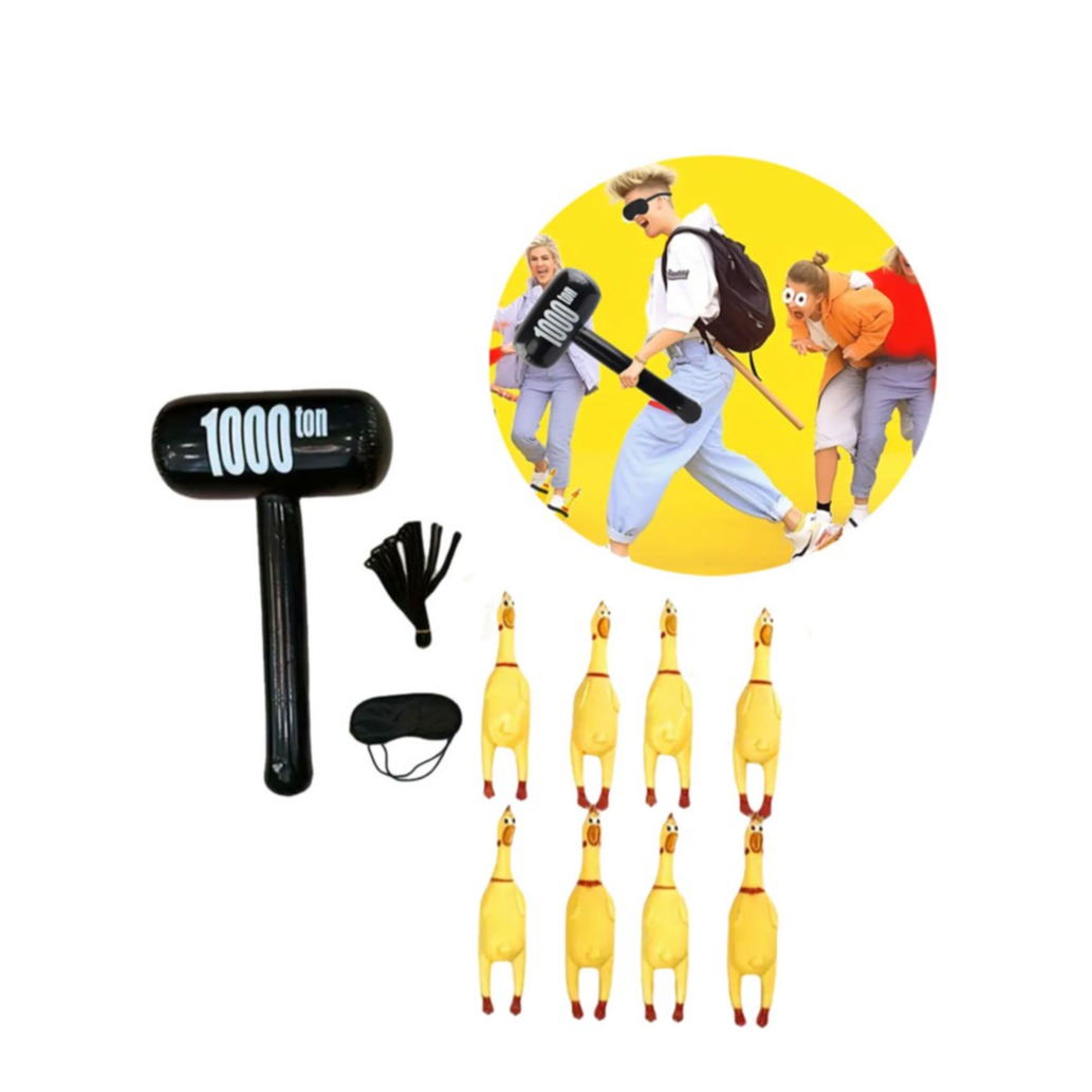 Mach dich bereit für eines der witzigsten Spiele aller Zeiten! Das „Schreiendes Huhn Schlag Spiel“ bringt jede Menge Action und Lacher auf deine nächste Feier. Ob beim Kindergeburtstag, an Partys mit Freunden oder als Teambuilding Spiel, bei „Hau das Huhn“ ist Spass garantiert! Mit dem aufblasbaren 1000 Ton Hammer, schreienden Gummi Hühnern und der mitgelieferten Augenmaske wird dieses Spiel zum Hit bei Gross und Klein.