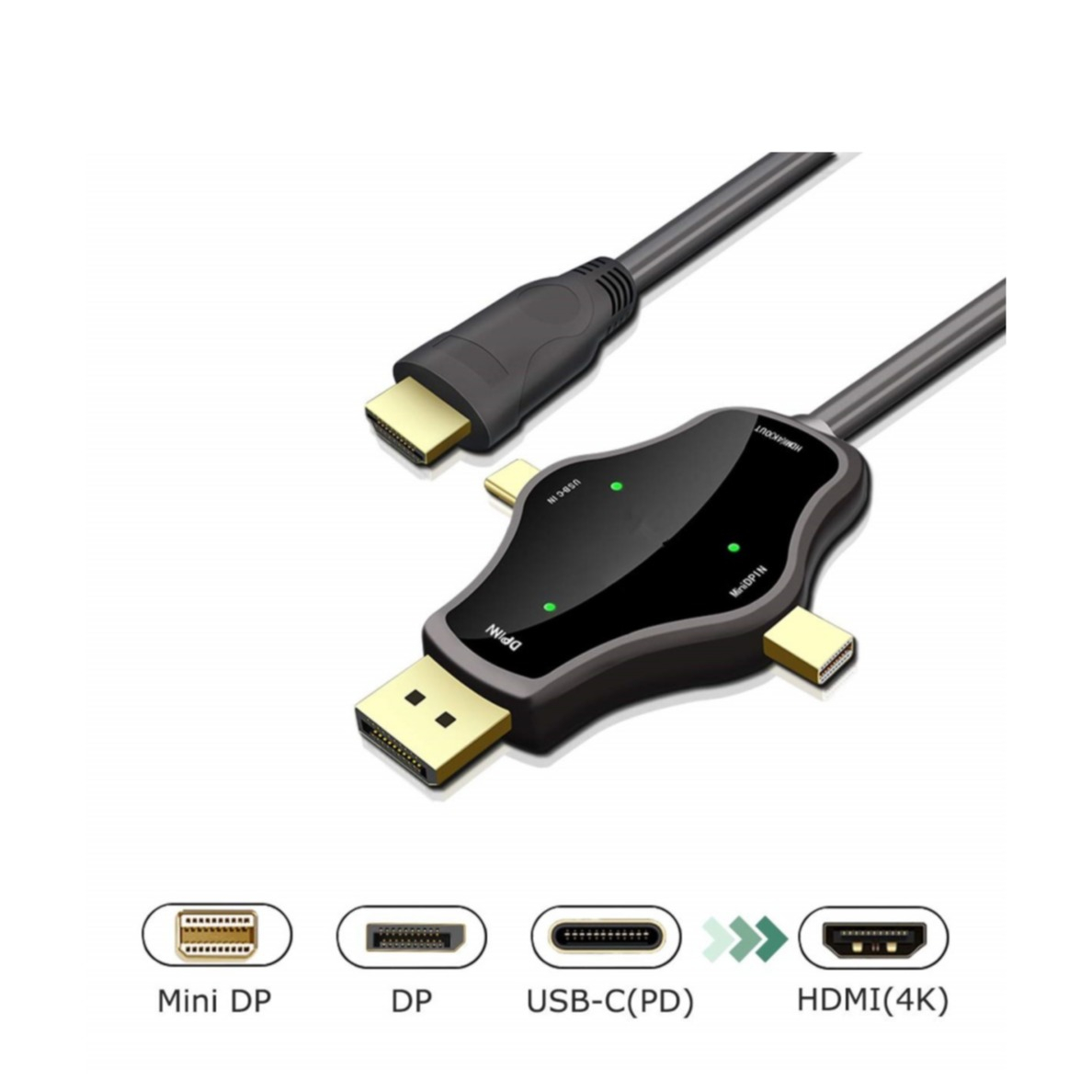 1 x 3in1 DisplayPort DP / USB C (Power Delivery) / Mini Displayport MDP auf HDMI Kabel