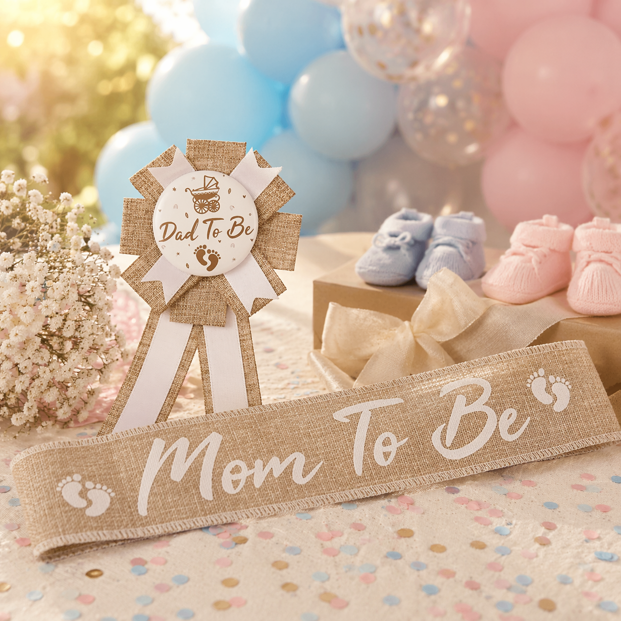 Mit diesem liebevoll gestalteten Baby Shower Accessoire Set setzt du dich und deinen Partner perfekt in Szene. Die Kombination aus Schärpe und Pin macht sofort klar, wer im Mittelpunkt steht – ideal für unvergessliche Momente bei deiner Baby Party oder beim Gender Reveal.