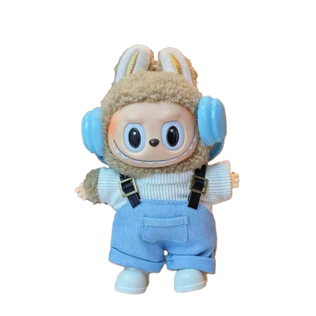 (3-tlg. Set) Monsterhäschen Denim Overall Puppen Zubehör Latzhose Outfit Verkleidungs Accessoire inkl. T-Shirt / Kopfhörer - Blau / Weiss