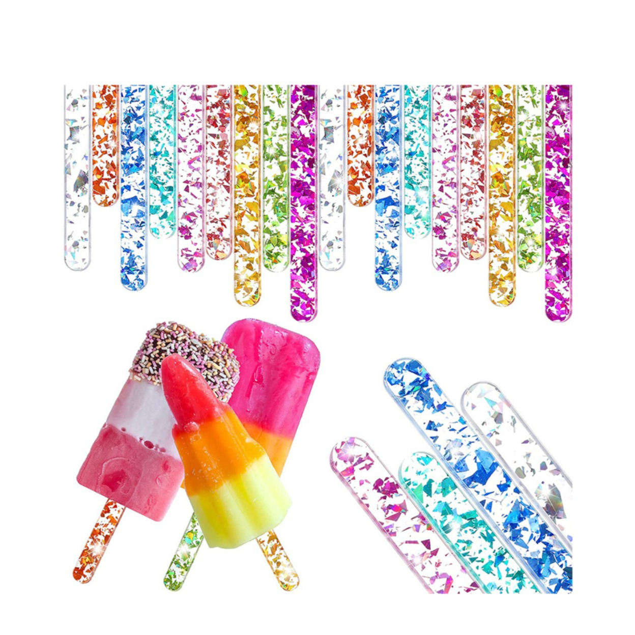 (20er Set) 11.5cm Acryl Eis Stiele DIY Glacé Sticks Wiederverwendbare Eiscreme Stäbe zum Basteln / Backen - Bunt / Glitzer