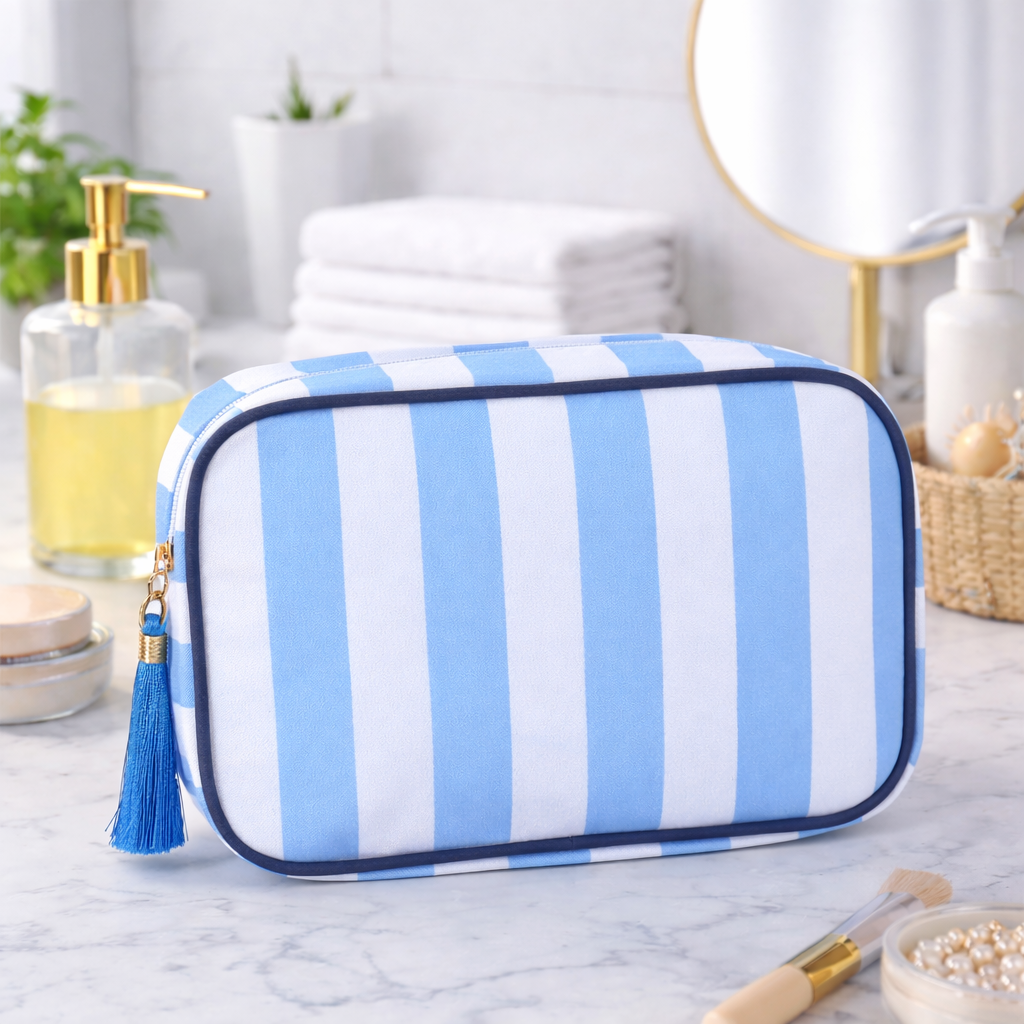 Mit dieser Kosmetik Tasche hast du deine Beauty Essentials stets gut organisiert. Die gestreifte Blau/Weiss Farbkombination sorgt für einen modernen Look, der auf jeder Reise auffällt. Der praktische Reissverschluss schützt deine Produkte und macht den Zugang einfach und schnell. Diese Necessaire Tasche ist perfekt für Kosmetik, Pflegeprodukte oder andere kleine Reiseutensilien und passt ideal in dein Handgepäck. Ob für den Urlaub oder für den Alltag, sie ist der perfekte Begleiter für deine Beauty-Routine.