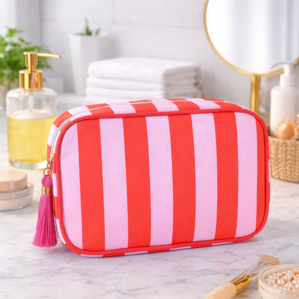 Mit dieser Kosmetik Tasche hast du deine Beauty Essentials stets gut organisiert. Die gestreifte Rot/Weiss Farbkombination sorgt für einen modernen Look, der auf jeder Reise auffällt. Der praktische Reissverschluss schützt deine Produkte und macht den Zugang einfach und schnell. Diese Necessaire Tasche ist perfekt für Kosmetik, Pflegeprodukte oder andere kleine Reiseutensilien und passt ideal in dein Handgepäck. Ob für den Urlaub oder für den Alltag, sie ist der perfekte Begleiter für deine Beauty-Routine.