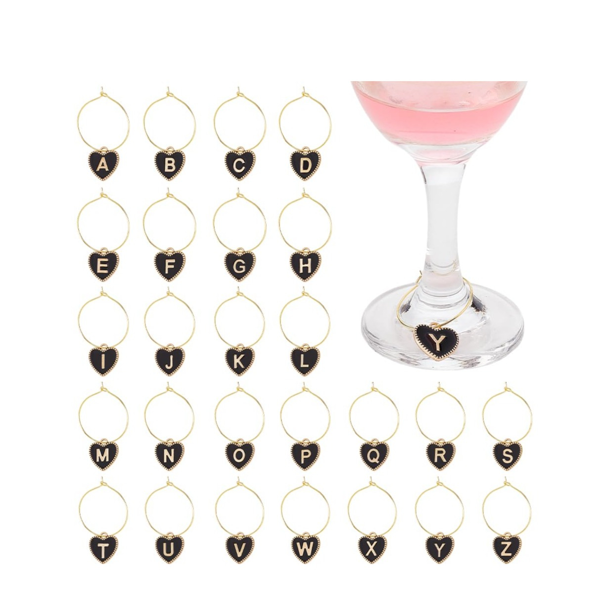 (26er Set) Glas Markierer Wiederverwendbare Trinkglas Buchstaben A-Z Herz Charms Markierungs Anhänger inkl. Aufbewahrungs Beutel - Schwarz
