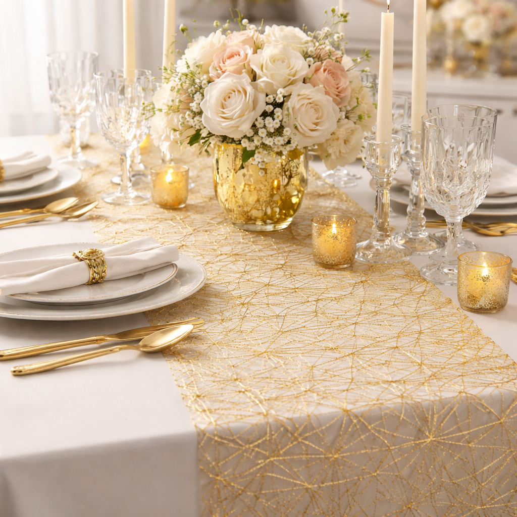 (28x277cm) Tüll Tischläufer Glänzendes Party Deko Tischtuch Zuschneidbares Tischsets - Gold / Silber