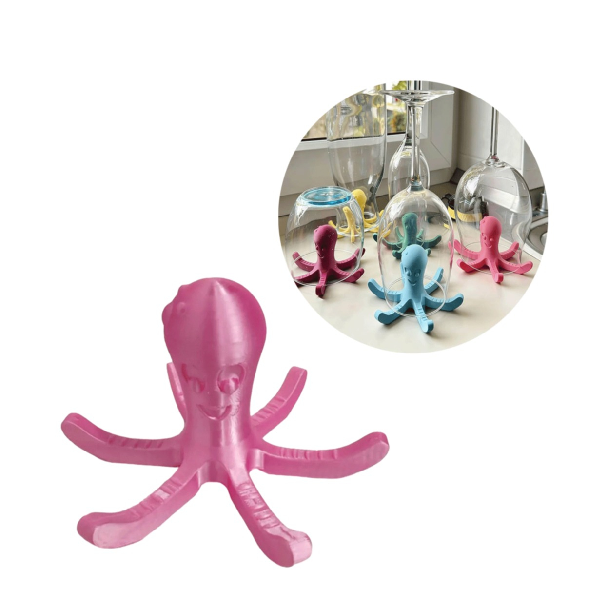 Mit dem Oktopus Abtropf Halter im praktischen 2er Set bringst du Ordnung und Farbe in deine Küche. Der kreative 3D Druck Tintenfisch sorgt nicht nur für einen Hingucker, sondern unterstützt dich auch beim hygienischen Trocknen von Geschirr wie Flaschen, Tassen oder Gläsern. Einfach aufstellen, Gefäss darauf platzieren und schon kann das Wasser sauber abtropfen.
