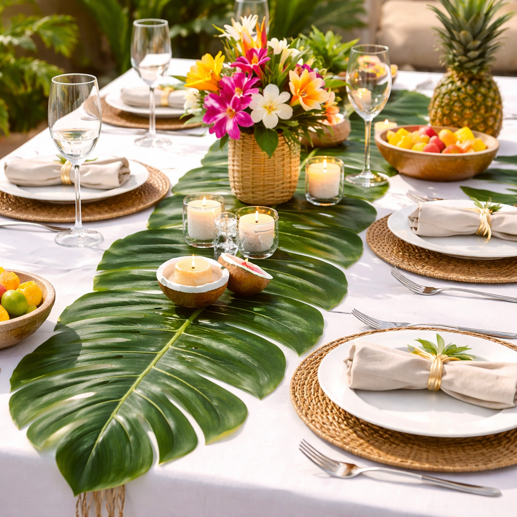 Hol dir echtes Ferienfeeling nach Hause und verwandle deinen Tisch mit diesem Palmen Blätter Tischläufer in eine tropische Oase. Das 2er Set ist perfekt geeignet für deine Hawaii Motto Party oder jede sommerliche Feier und sorgt sofort für eine entspannte, exotische Deko Atmosphäre.