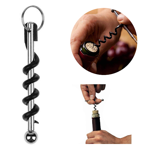 2in1 Edelstahl Korkenzieher Schlüsselanhänger Weinflaschenöffner Accessoire mit Spaltring - Silber / Schwarz