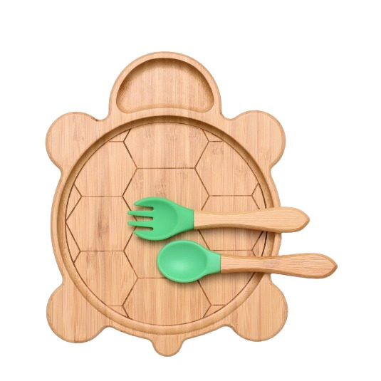 (3-tlg. Set) Rutschfester Bambus Teller mit Saugnapf Kindergeschirr inkl. Silikon Besteck - Schildkröte