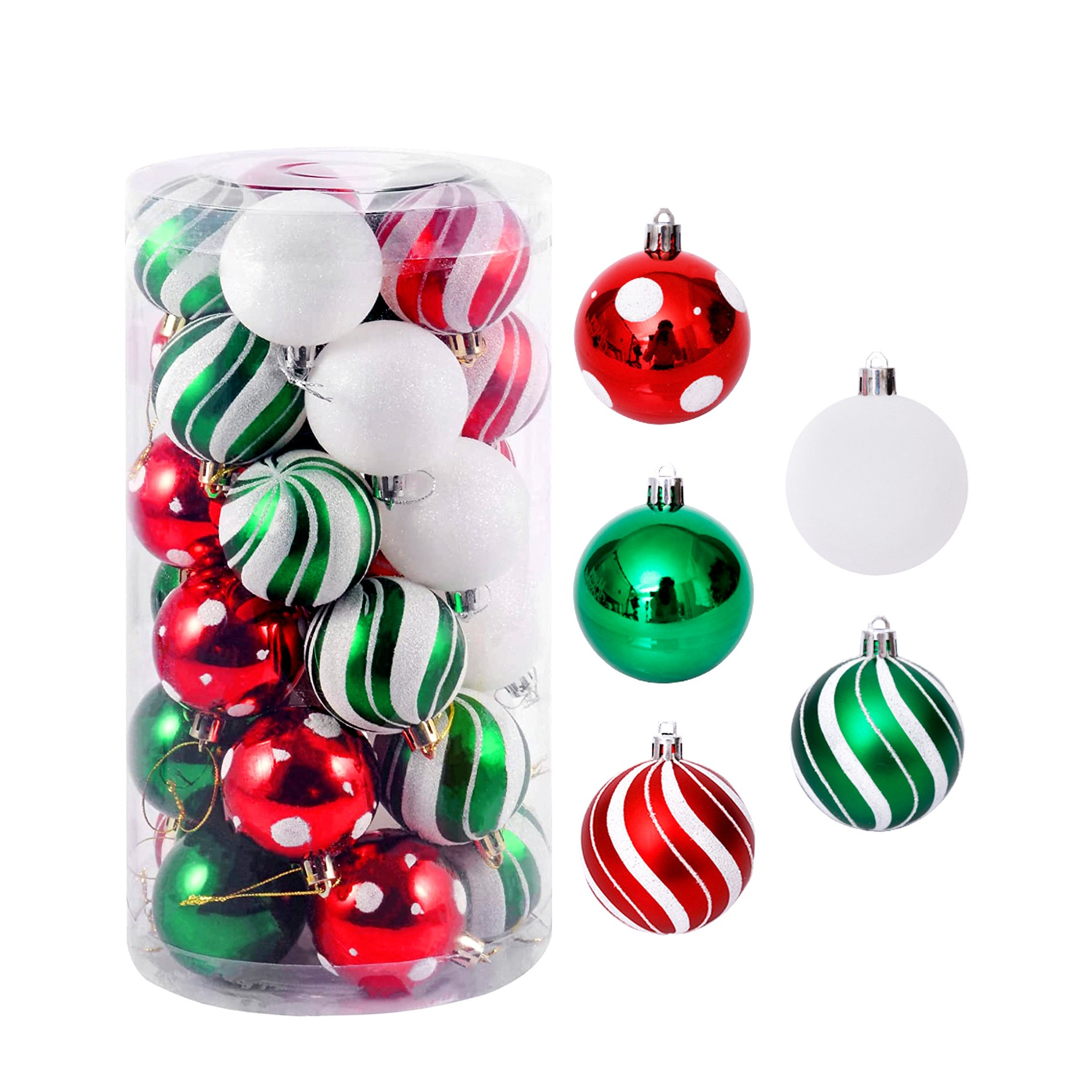 (30er Set) Ø6cm Christbaum Schmuck Glitzer Weihnachtskugeln Tannenbaum Aufhänger Home Deko mit Streifen Motiv - Rot / Grün / Weiss