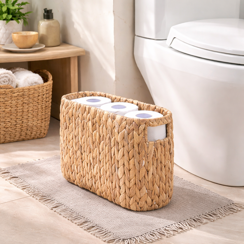 Das dekorative, geflochtene Design macht den Korb zu einem echten Hingucker und verleiht deinem Badezimmer eine warme und natürliche Note. Gleichzeitig sorgt die offene Struktur dafür, dass du jederzeit schnell auf deine Toilettenpapier Rollen zugreifen kannst.
