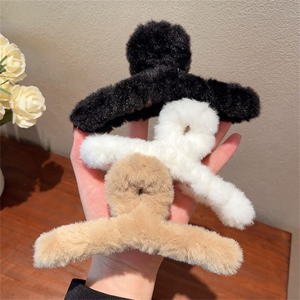 (3er Set) 12cm Haarspange Klammer Plüsch Krallen Clip Haar Accessoire - Schwarz / Beige
