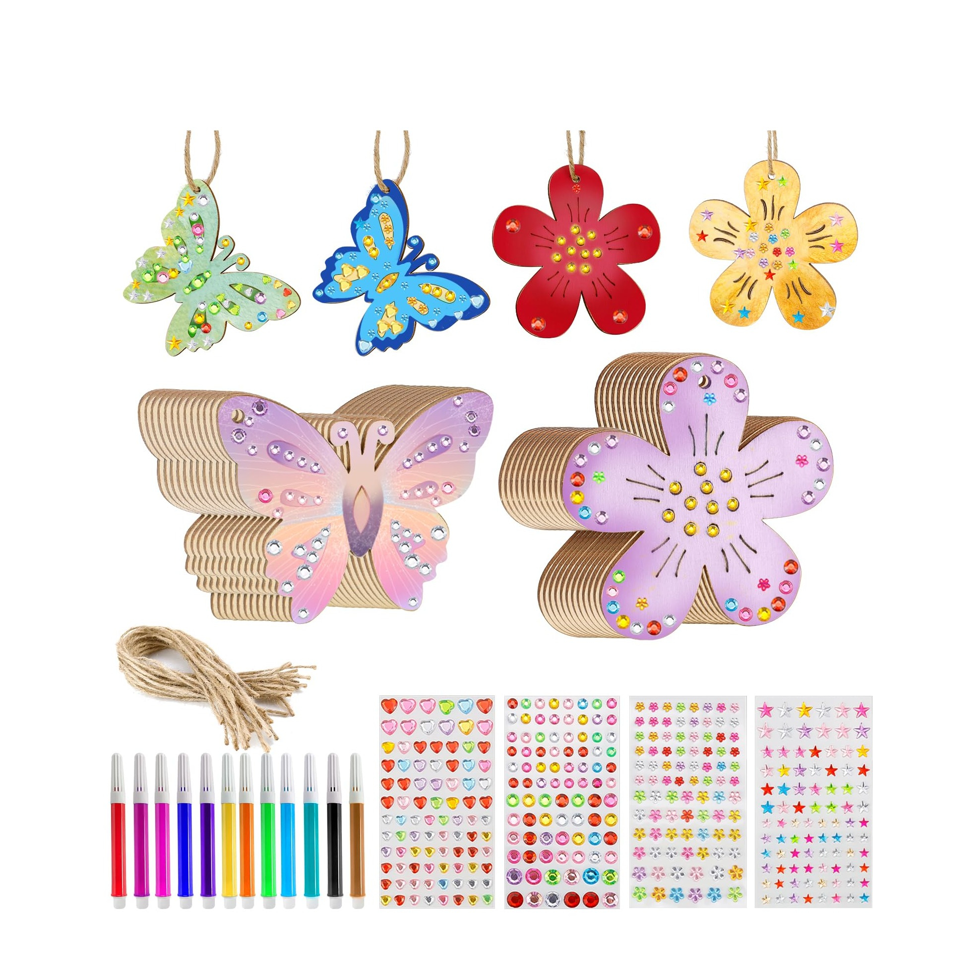 (42-tlg. Set) Holz Frühling Aufhänger DIY Bastel Home Deko Ornament inkl. 3D Edelsteine Sticker / Filzstifte / Schnur - Schmetterling / Blume