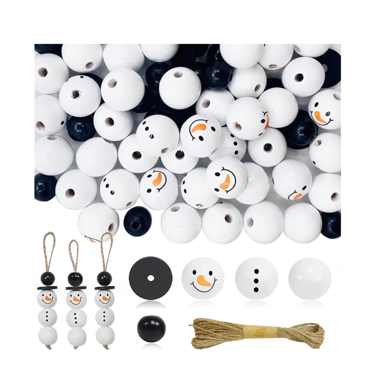 (51-tlg. Set) Holz Perlen Weihnachts Dekoration DIY Christbaum Accessoire zum Basteln inkl. Schnur - Schneemann