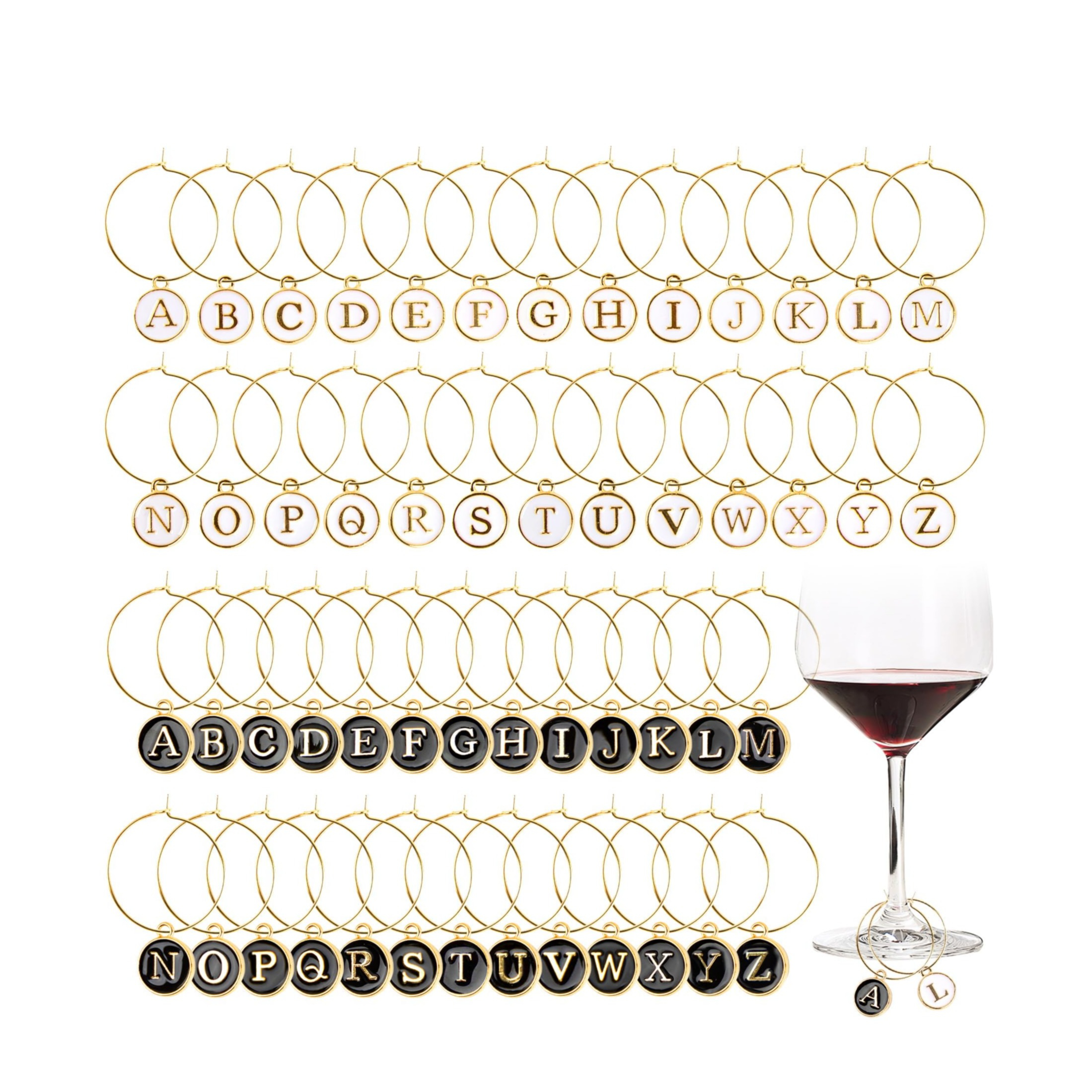 (52er Set) Glas Markierer Wiederverwendbare Trinkglas Buchstaben A-Z Charms Markierungs Anhänger inkl. Aufbewahrungs Beutel - Schwarz / Weiss