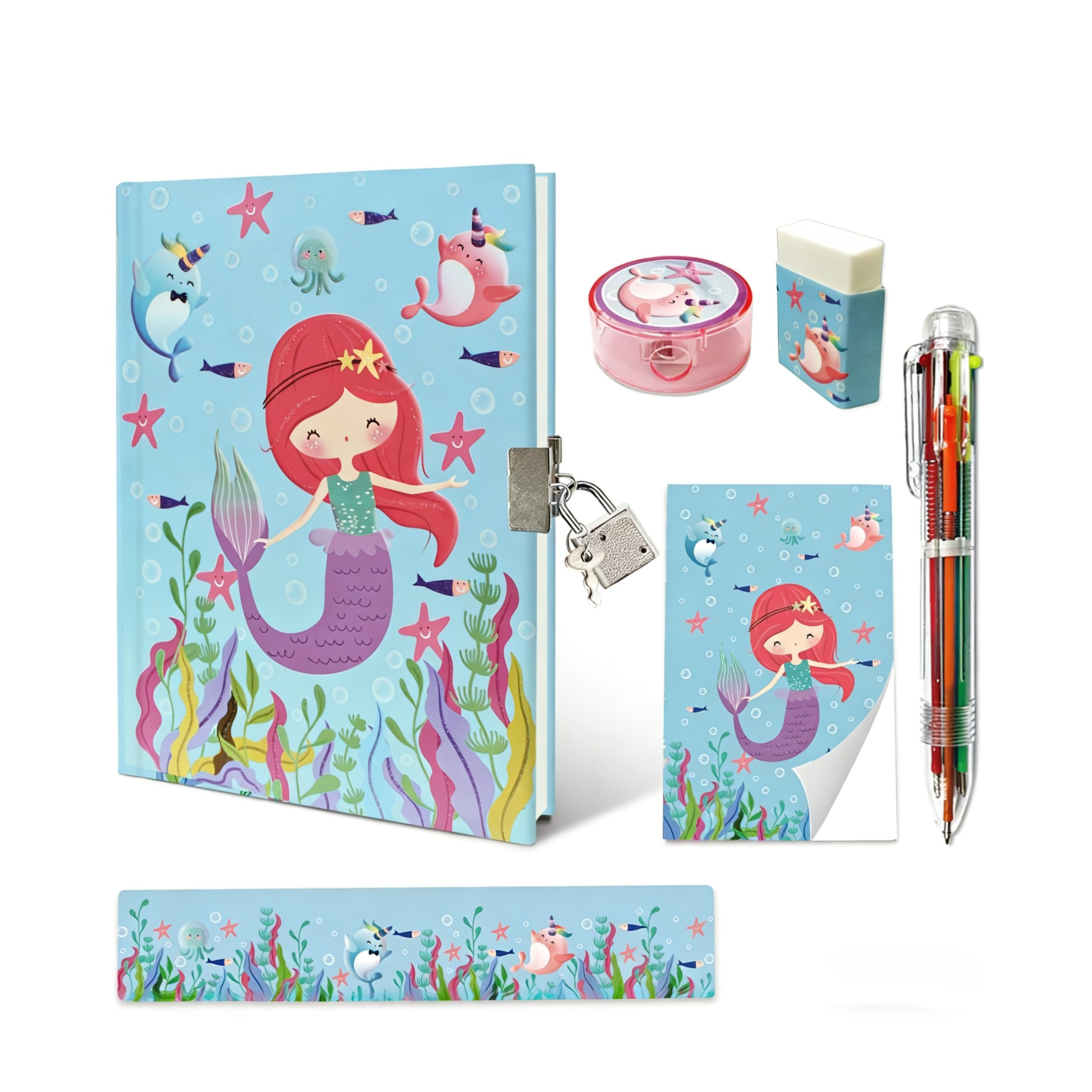 (6-tlg. Set) 18x13.5cm Kinder Notizbuch Schul Schreib Set inkl. Kugelschreiber / Radiergummi / Lineal - Meerjungfrau