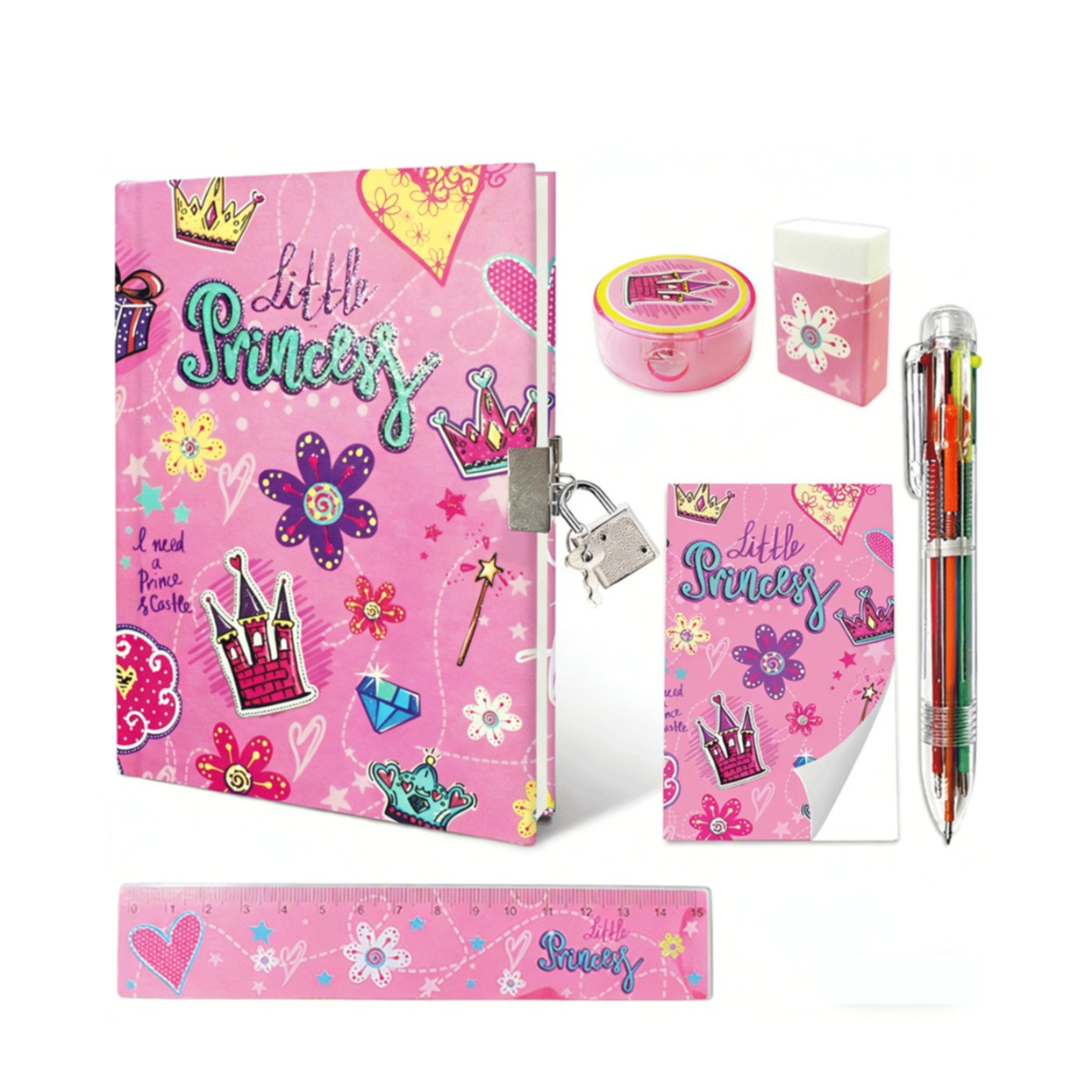 (6-tlg. Set) 18x13.5cm Kinder Notizbuch Schul Schreib Set inkl. Kugelschreiber / Radiergummi / Lineal - Prinzessin
