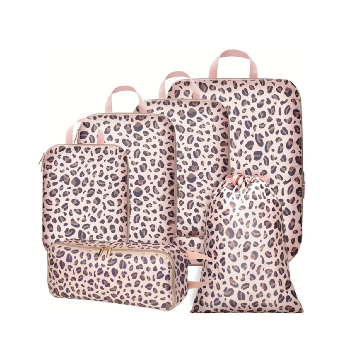 (6-tlg. Set) Spritzwasserfester Koffer Organizer Reise Gepäck Kompressions Kleidertaschen Leopard - Rosa / Braun