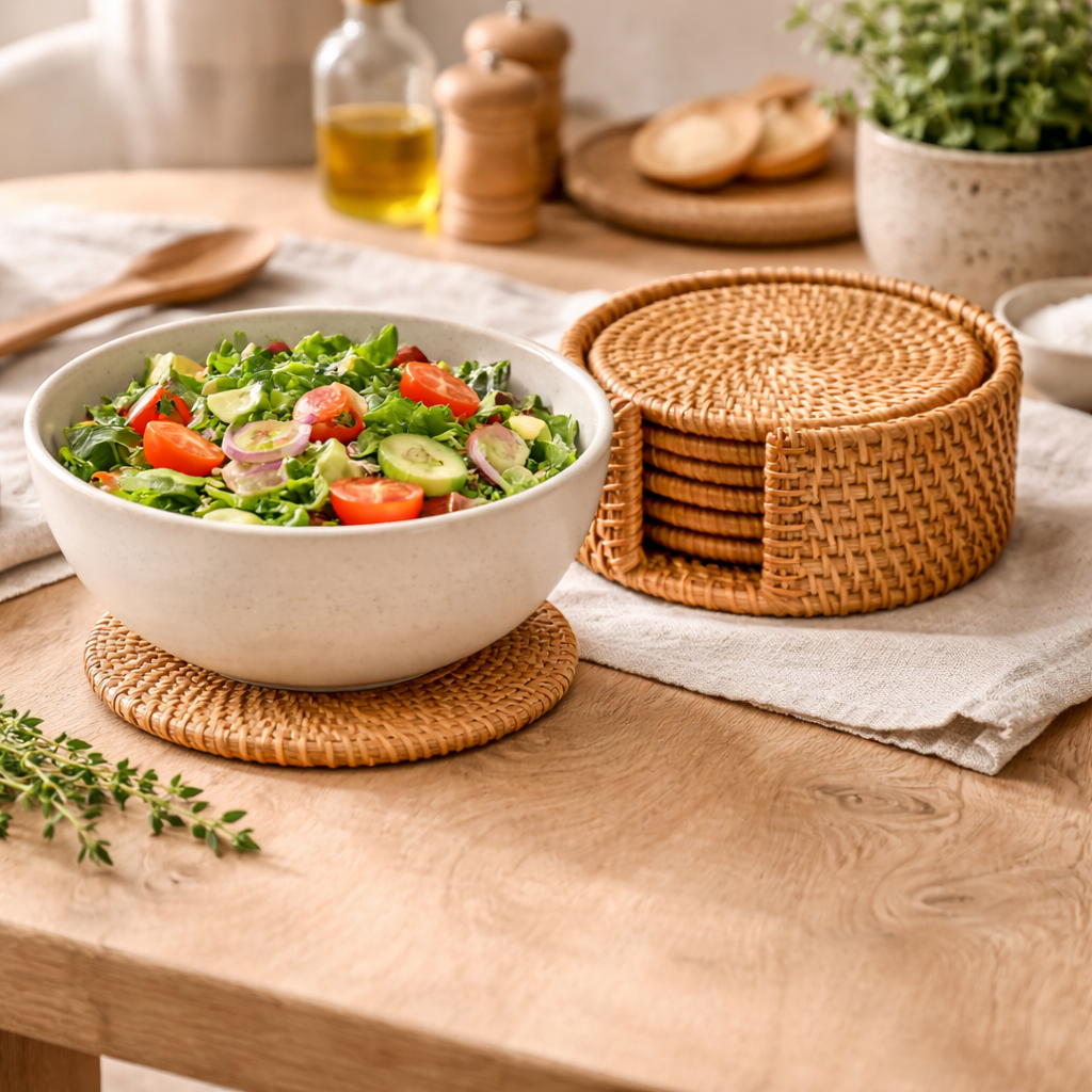 Das natürliche Design aus Rattan in Braun verleiht deinem Zuhause eine warme und gemütliche Atmosphäre. Gleichzeitig sorgen die Untersetzer für eine stilvolle Deko, die sich harmonisch in verschiedene Wohnstile einfügt – ob im Wohnzimmer, Essbereich oder auf dem Balkon.
