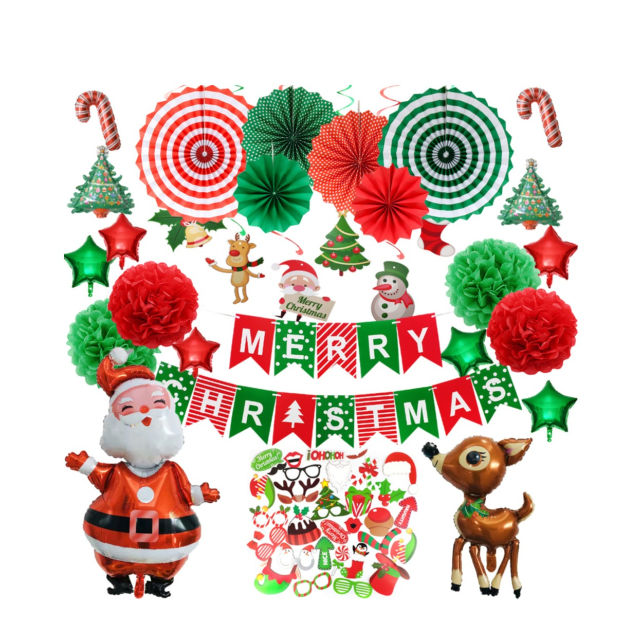 (73-tlg. Set) Merry Christmas Girlande Weihnachts Party Dekoration + Ballons / Papierfächer / Spiralen Girlande / Fotorequisiten - Rot / Grün