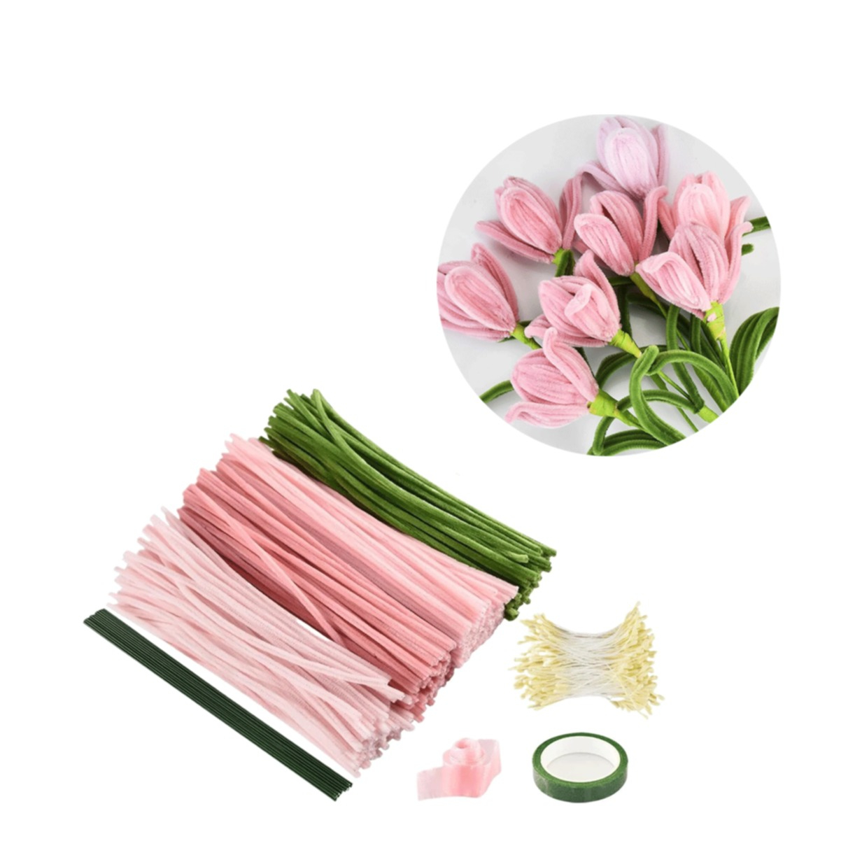 (775-tlg. Set) Pfeifenreiniger Blumen Strauss DIY Chenille Bastel Kit inkl. Draht / Tape / Geschenkband - Pink