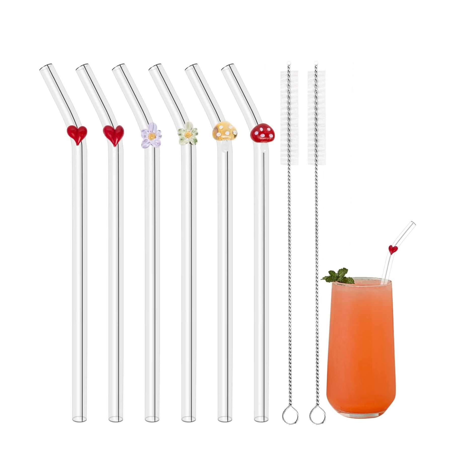 (8-tlg. Set) 20cm Glas Strohhalme Gebogen Wiederverwendbare Motiv Trinkhalme inkl. Reinigungsbürsten - Herzen / Blumen / Pilze