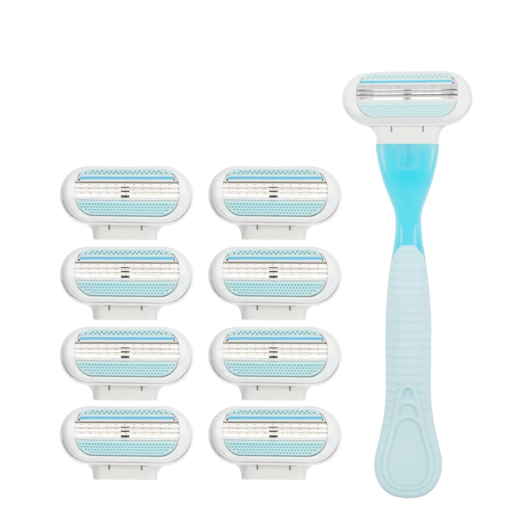(9-tlg. Set) Nass Rasierer Wiederverwendbarer Haarentferner mit 3-fach Klinge / 8 Ersatz Aufsätzen - Blau