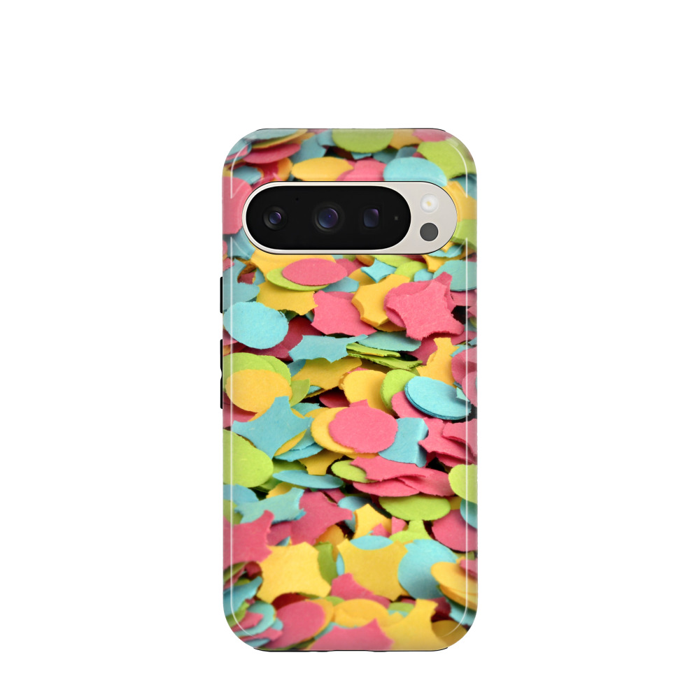 Google Pixel 9 Hybrid (Kunststoff / Gummi) Hülle Konfettipracht - Blau / Gelb / Rot