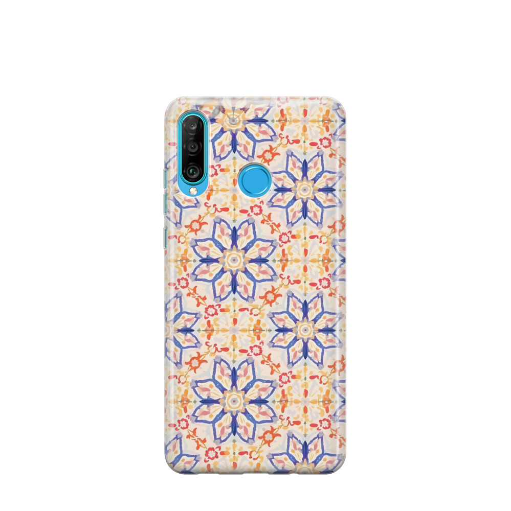 Huawei P30 Lite New Edition Gummi Hülle Majolika-Aquarellblüte - Blau / Gelb / Rot