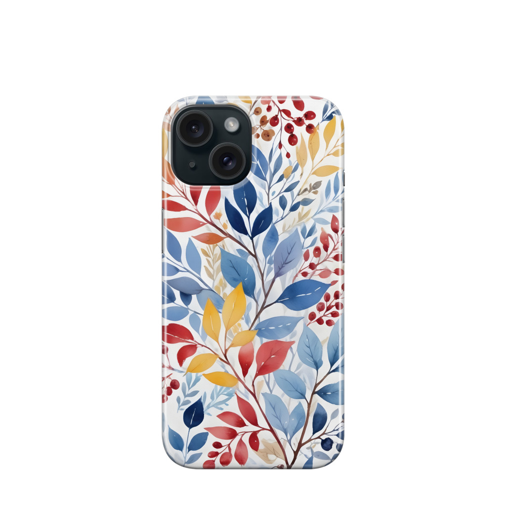 iPhone 15 Gummi Hülle Frostiger Blättertanz - Blau / Gelb / Rot