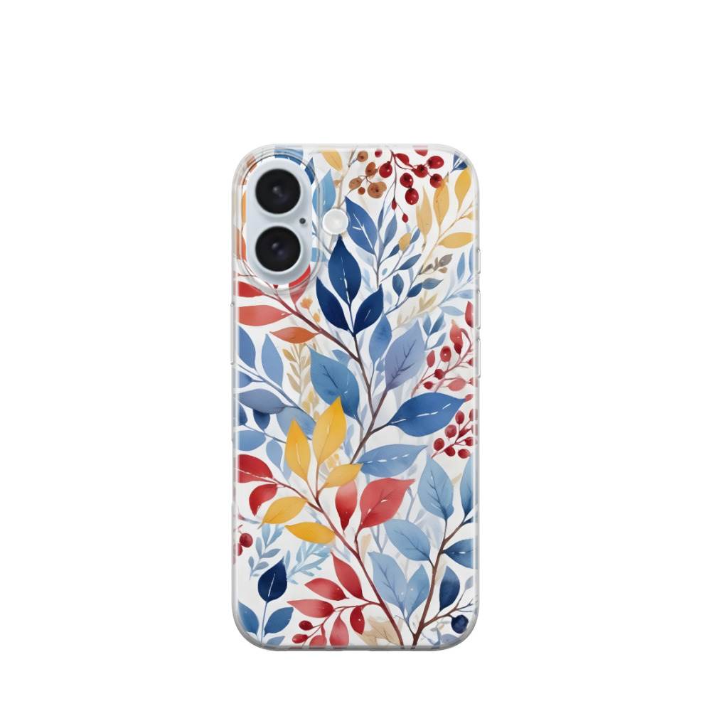iPhone 16 Gummi Hülle Frostiger Blättertanz - Blau / Gelb / Rot