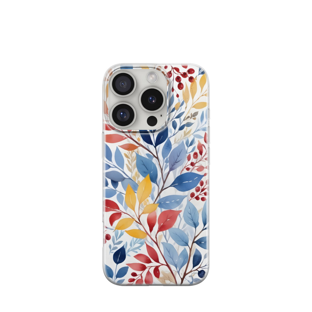iPhone 16 Pro Gummi Hülle Frostiger Blättertanz - Blau / Gelb / Rot