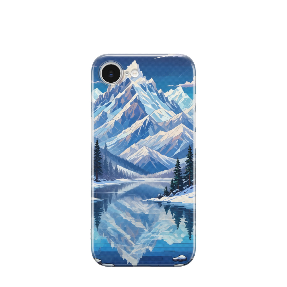 iPhone 16e Gummi Hülle Bergzauber im Eissee - Blau