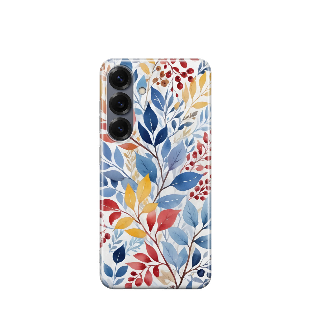 Samsung Galaxy S25 Gummi Hülle Frostiger Blättertanz - Blau / Gelb / Rot