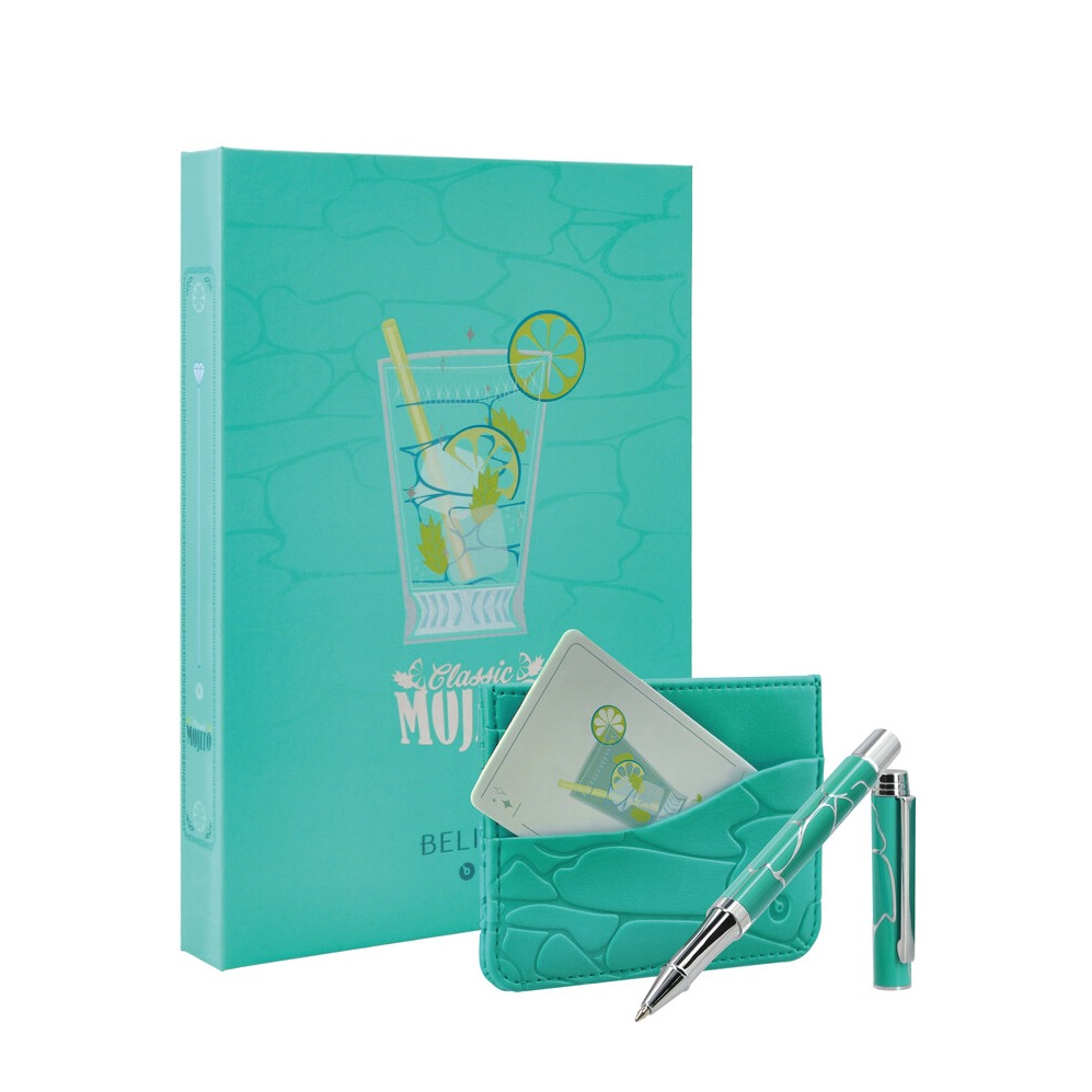 (4-tlg. Set) The Cocktail Menu Aluminium Kugelschreiber mit Deckel inkl. Kreditkarten Etui RFID + Geschenk Schachtel (BB366) - Mojito