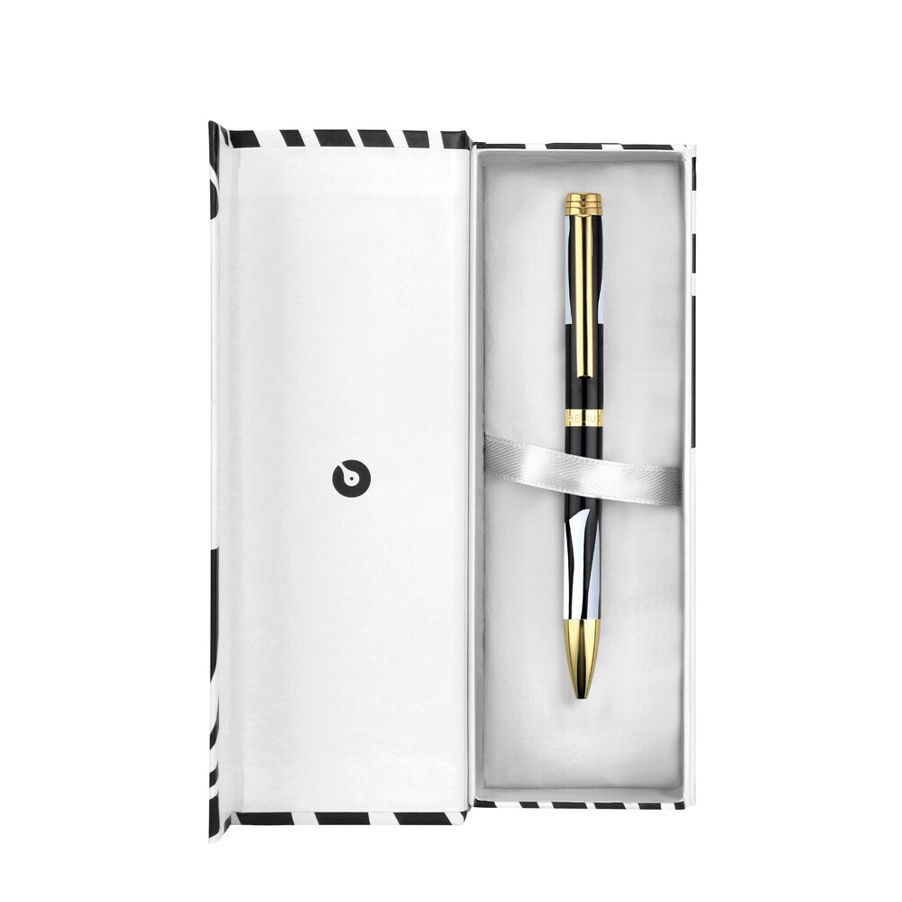 Dann ist dieser elegante Kugelschreiber von BELIUS eine geschmackvolle Wahl. Der hochwertige Schaft aus Aluminium überzeugt mit einem modernen Design in den Farben Schwarz und Weiss. Das Design ist von Kontrast und Dualität inspiriert und wird durch goldene Details zusätzlich hervorgehoben. Der Deckel mit Metallclip schützt die Spitze und sorgt dafür, dass der Stift sicher befestigt werden kann. Mit seiner blauen Schreibfarbe eignet sich das Schreibgerät ideal für Notizen, Unterschriften oder den täglichen Gebrauch. Dank der nachfüllbaren Mine begleitet dich der Stift langfristig im Alltag. Geliefert wird er in einer passenden Geschenk Schachtel, die das edle Gesamtbild harmonisch abrundet und ihn zu einem besonderen Präsent macht.