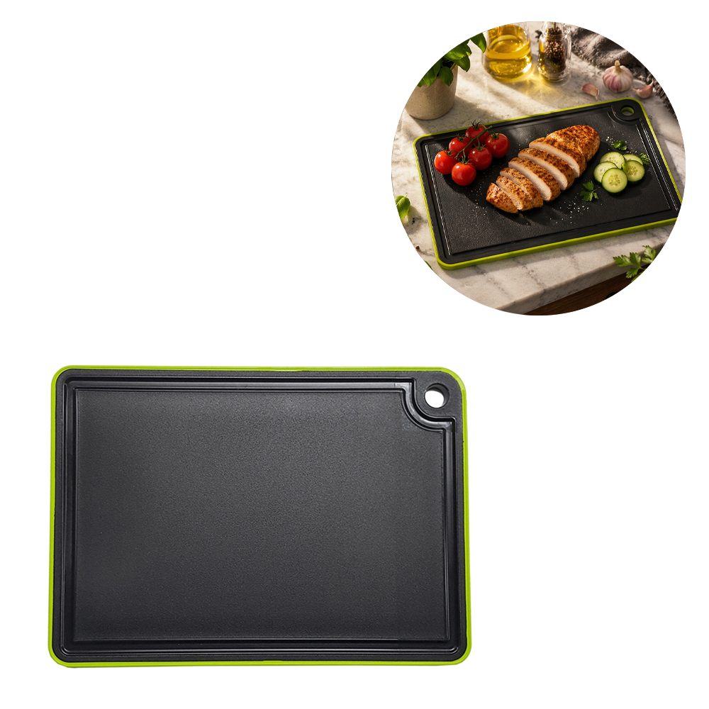 Dank der integrierten Anti-Rutsch Funktion bleibt das Tranchierbrett stabil an seinem Platz und sorgt für mehr Sicherheit bei der Küchenarbeit. Die Saftrille fängt austretende Flüssigkeiten zuverlässig auf, sodass deine Arbeitsfläche sauber bleibt. Gefertigt aus Kunststoff, ist das Brett pflegeleicht und bestens für den täglichen Einsatz geeignet. Die Farbkombination in Schwarz und Grün setzt zudem einen modernen Akzent in deiner Küche.