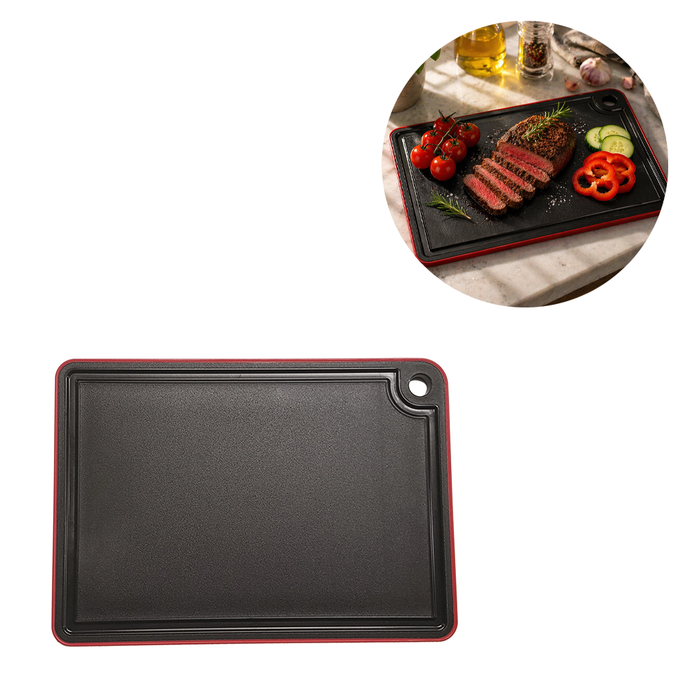 Dank der integrierten Anti-Rutsch Funktion bleibt das Tranchierbrett stabil an seinem Platz und sorgt für mehr Sicherheit bei der Küchenarbeit. Die Saftrille fängt austretende Flüssigkeiten zuverlässig auf, sodass deine Arbeitsfläche sauber bleibt. Gefertigt aus Kunststoff, ist das Brett pflegeleicht und bestens für den täglichen Einsatz geeignet. Die Farbkombination in Schwarz und Rot setzt zudem einen modernen Akzent in deiner Küche.