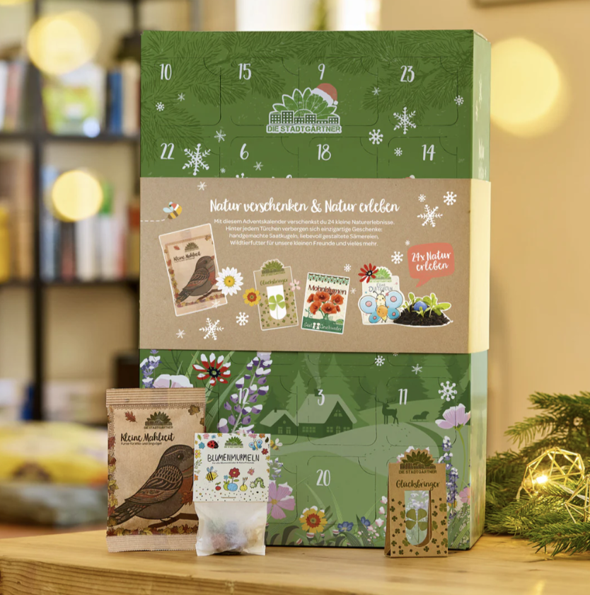 Erlebe die Adventszeit auf eine ganz besondere Weise, mit dem Naturerlebnis Adventskalender von Die Stadtgärtner. Hinter 24 liebevoll gestalteten Türchen warten nachhaltige Überraschungen rund um Garten, Pflanzen und Natur. Jeden Tag findest du ein neues Saatgut Tütchen, Steckling oder Garten Accessoire, das dich zum Aussäen, Beobachten und Staunen einlädt. Ob Bienenblumen, Kräuter, Wildpflanzen oder kleine Bastelideen, dieser Kalender bringt Leben, Farbe und Freude in die Winterzeit. Der Saatgut Adventskalender wird in Deutschland gefertigt und steht für Nachhaltigkeit, Kreativität und Naturverbundenheit. Perfekt für Gartenliebhaber, Familien oder alle, die in der Weihnachtszeit etwas Sinnvolles verschenken möchten.