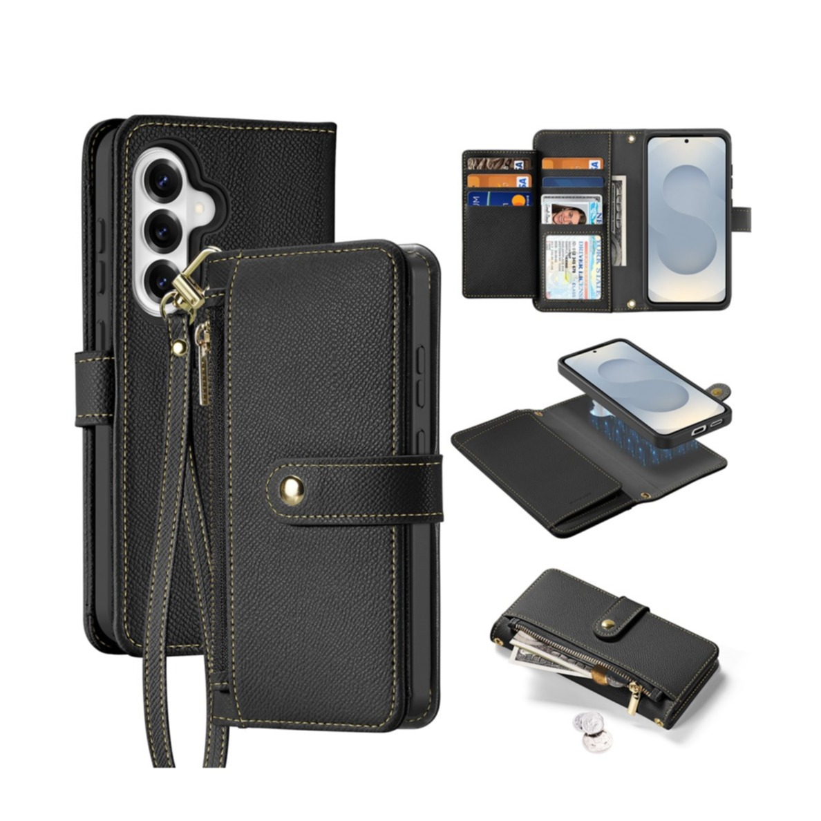 Samsung Galaxy S26+ Plus Kunstleder Tasche mit Kartenfächer + Münzfach + MagSafe-Modul Schutzhülle - Schwarz