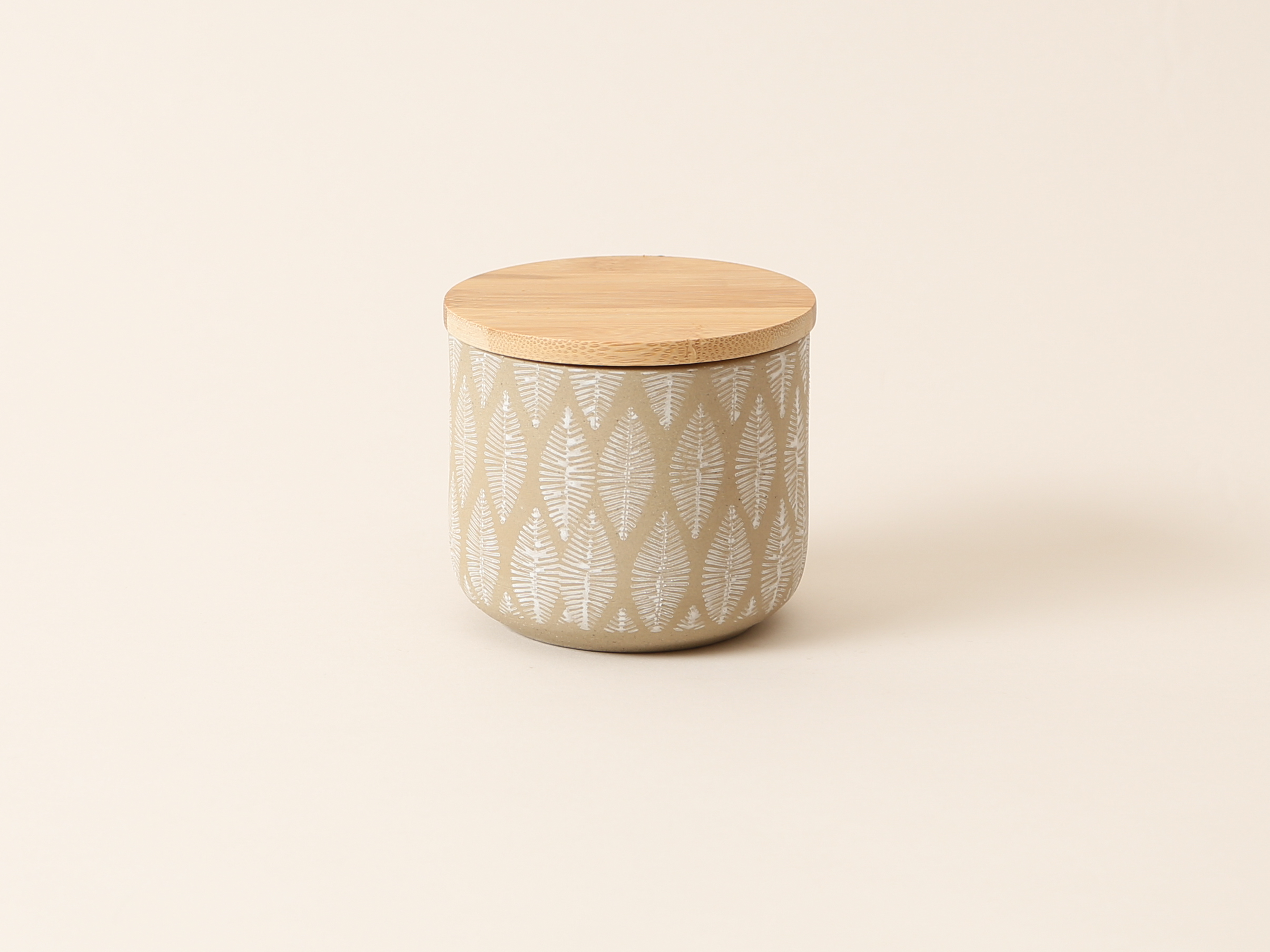 (10x10cm) Steingut Dose mit Bambusdeckel für Aufbewahrung - Blättermotiv