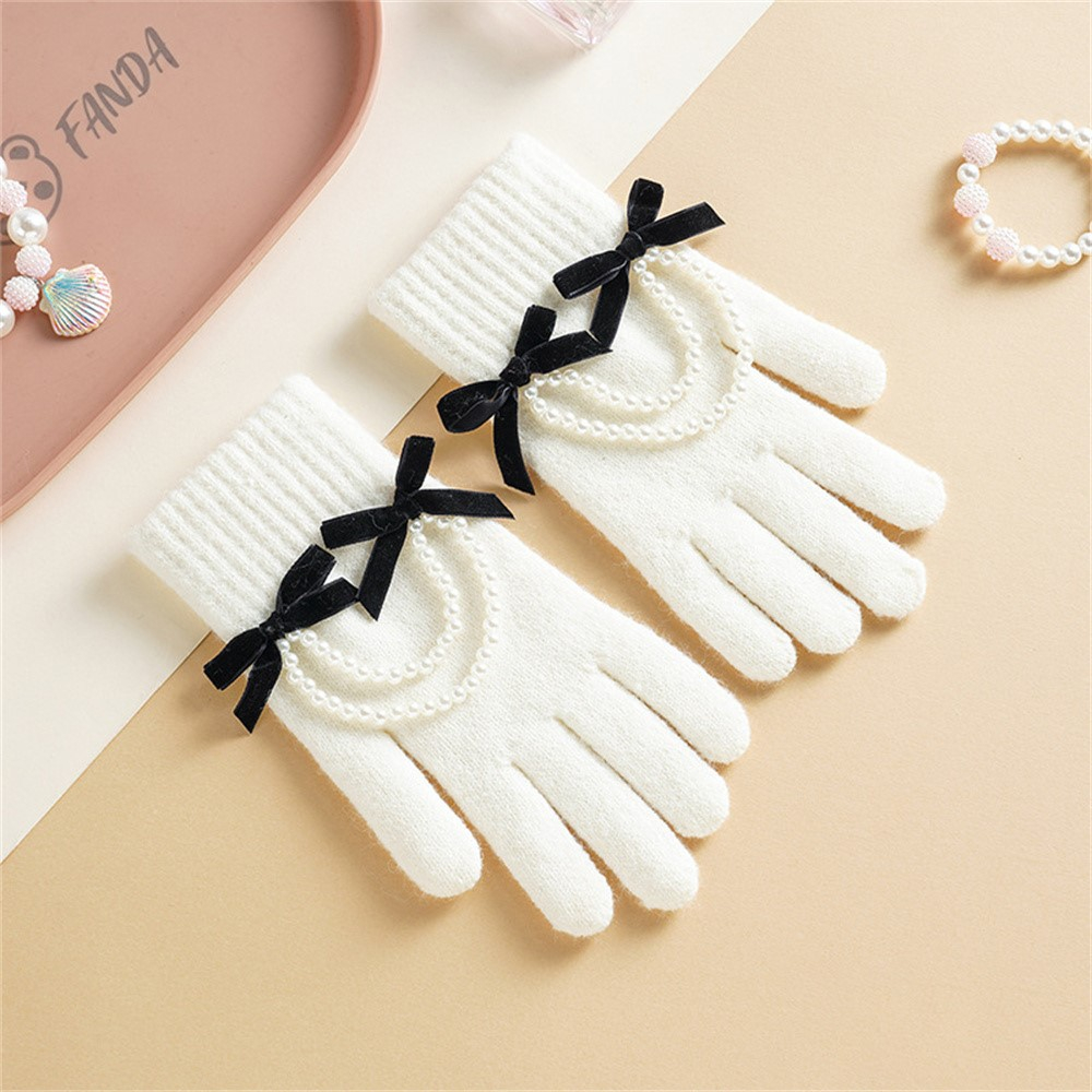 (1 paire) Gants Femme Capacitif Écran Tactile avec Noeuds + Perles (One Size) pour Smartphone / Tablette - Blanc